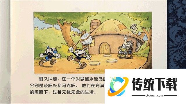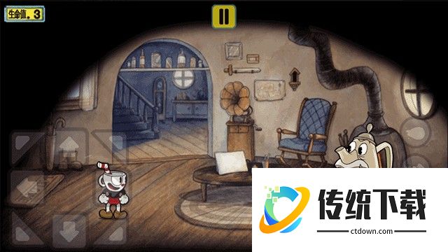 4、接着,在这里和茶杯头老爷爷对话,靠近它按下A键(跳跃键);
