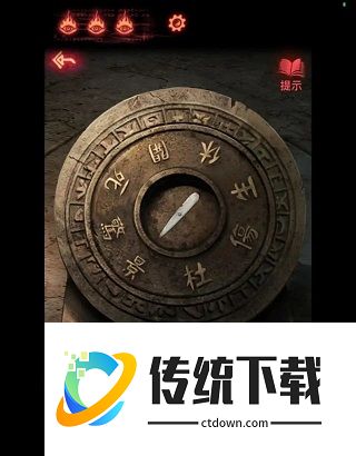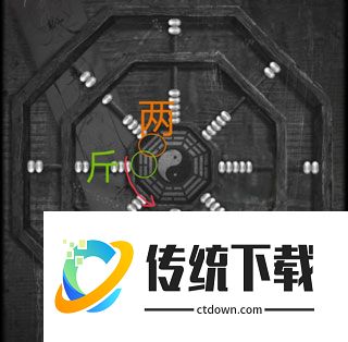 10、回到忌物阁,将【指针】放入通道中的罗盘上,指针会开始旋转。按照顺序我们获得的字是:伤景休景死杜。然后去旁边地上的八卦阵上按照顺序点击字,揭开机关,找到倒立的塔。