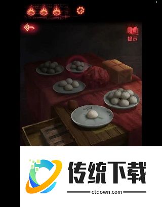 2、点击下方箭头,再点击右侧箭头,来到本章节第三个场景---忌物阁,点击中间墙面,完成转方格小游戏后,获得墙面线索(8王4鬼5口1木8虫),回到大门处,点击左侧磁盘,按照前面的个数依次在盘中放入糖瓜(8王4鬼5口1木8虫),打开抽屉获得【蜡烛】和【石板】。