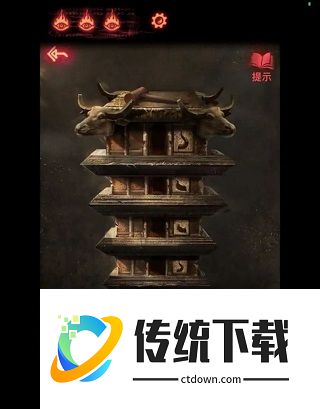 11、倒立的塔上的图案对应葬经阁内的牛角拉动,塔上图案从下往上的顺序是全角,鼻环,全角,半角,半角,全角,之后去葬经阁按照这个顺序点击牛头上对应的位置,得到一张星星图纸。