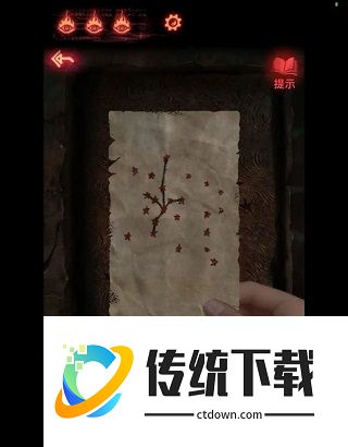 12、根据星星图纸的提示,回到忌物阁,点击最里面的墙面,按照图纸上黑线连接的星星来点亮门上的星星,进入下个场景---花园