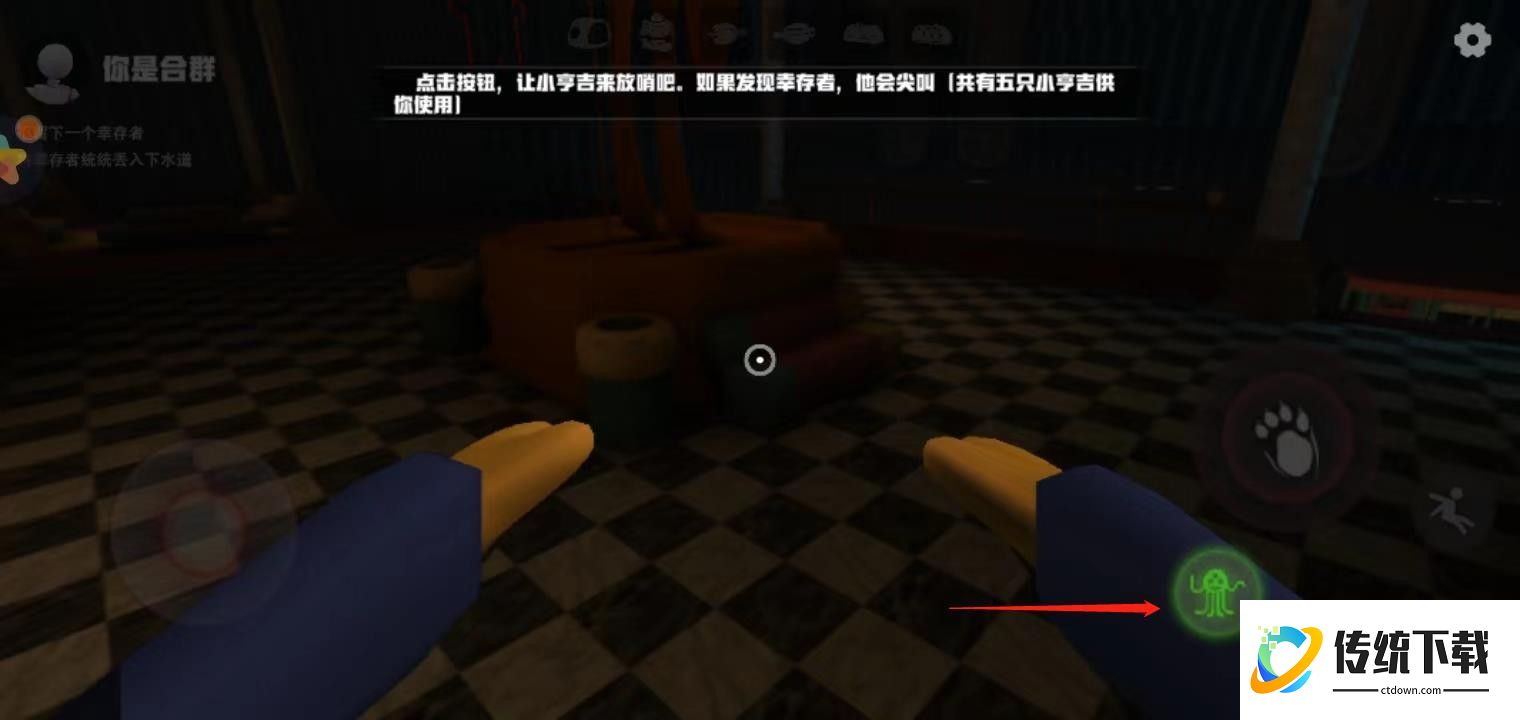 点击按钮,可以让小亨吉放哨,如果发现幸存者,它就会尖叫。(一共有5只)