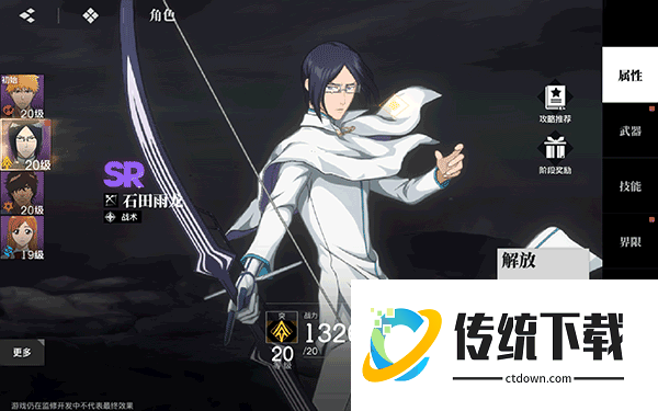 石田雨龙(SR):远程灭却师,神圣灭矢与近战角色形成互补,专属武器「弧雀」大幅提升基础属性。