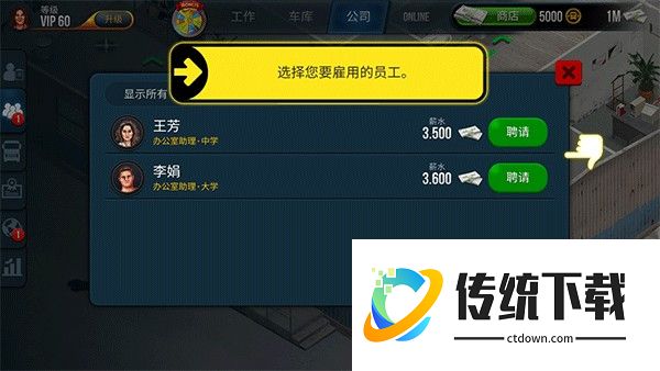 4、根据引导进入“公司”界面,招募你的第一名员工。