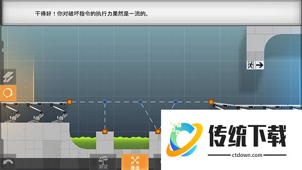 斜坡。这一关用到了三角形稳定结构,先铺设上一层桥面,然后点击桥面进行硬化,在桥面的下方,搭设三角形结构进行支撑,即可通关。