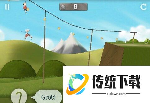 游戏的页面非常简洁,左边的拐杖按键是用来钩挂缆绳或者凸起物,在游戏中后期难度提升时会加入这个元素。