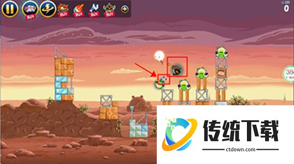 【1-5】第五关的鸟不一般,在发射过程中,点击屏幕可以在点击的地方有个冲击力,如图红框,利用这点,能将猪猪震开。