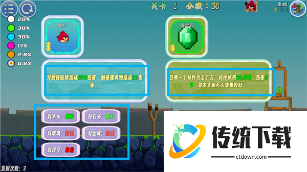 2、每次发射前系统会给一只随机鸟,玩家可以根据鸟的技能信息进行发射。