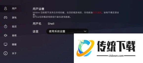 在用户设置模块,玩家可以设置用户名,以及更改语言设置,目前版本提供了中文,繁体中文,英文和日语四个选项以供选择。