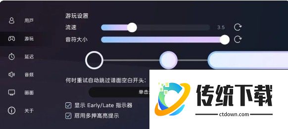 游玩设置模块可以调整流速,音符大小以及重试方式,此外还有指示器和多押提示选项。玩家可以多次调整流速和音符大小来找到自己心仪的配置。