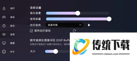 在音频设置模块,玩家可以调节游玩音量,以及调试缓冲区大小。