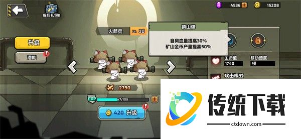 5、游戏金币的获取、大大们刚开始优先把如图以下 2 个兵营里的等级优先升到 20 级、这样可以提高矿井里生产金币数量。