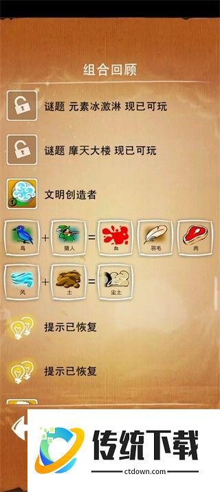 游戏中有一个提示系统,当你卡在某个合成过程中时,可以试着用提示来帮助你找到正确的答案。提示每次使用需要消耗一定的游戏币。