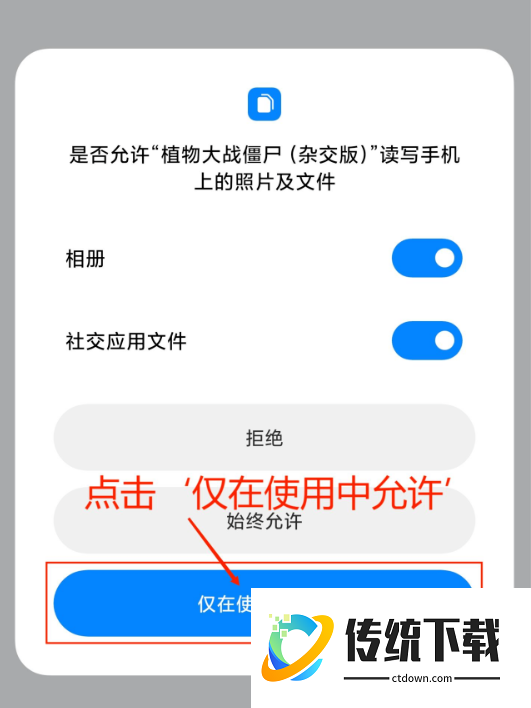 1、游戏启动需要给予相关权限,点击‘仅在使用中允许’