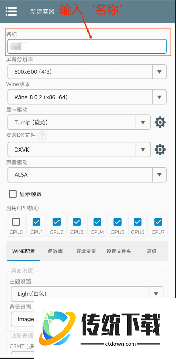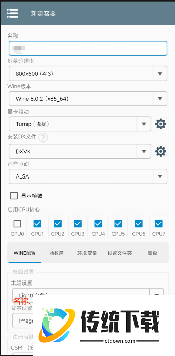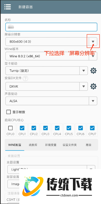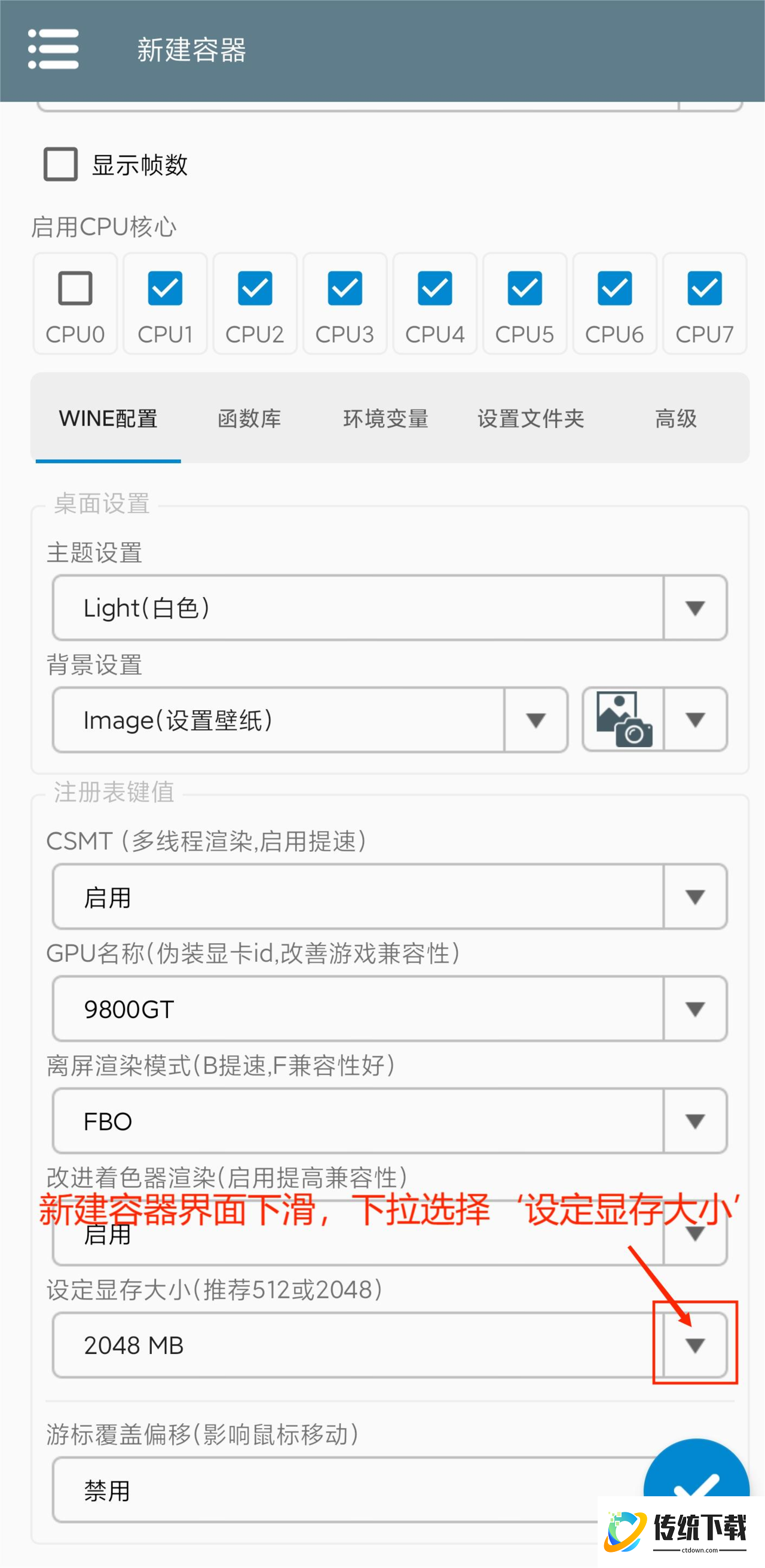 5.新建容器界面下滑,下拉选择‘设定显存大小’(建议手机配置较低的,显存大小调小点)