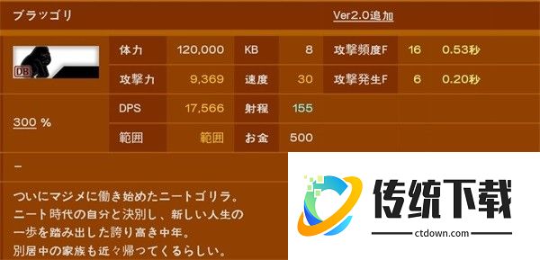 超高伤害,射程也长,攻频也不低,射程低于390的基本摸不到,量产炮灰一击死,大多数人在打大狂墙时都没有能真正稳住的炮灰,不过,经过测试60来级满生命本能加体力联组的拉面王是可以抗住一下的,有能力的可以试一试。回到正题,变态的血量是塔的两倍多,可以尝试偷塔,若要正攻,主力大猫射程最好要在440往上,这关对大狂墙的击退尤为重要,1kb意味着没控制的话它到死都不会退后一步,所以推荐使用狼女等有效击退角色,配合狙击效果更佳