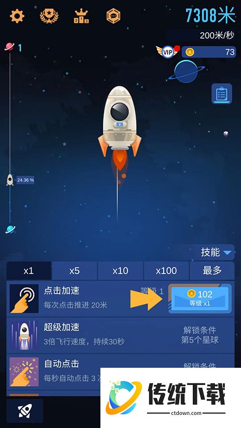 4、当我们拥有金币后可以点击左下角【小火箭】图标,可进行购买使用点击加速、超级加速和自动点击等道具功能,
