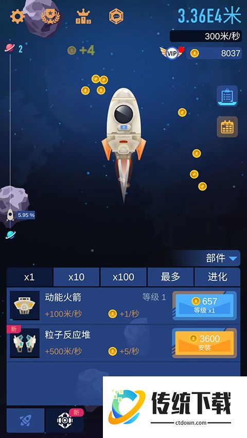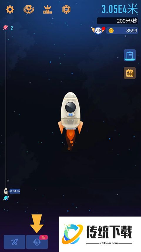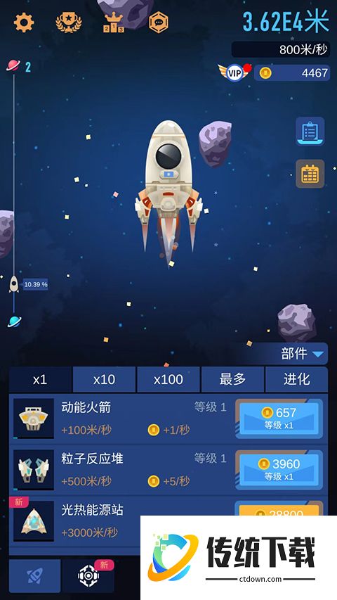 5、点击左下角【装备】图标,可以购买动能火箭、粒子反应堆和光热能源站等装备,让我们的火箭可以更加快速的抵达目标星球,