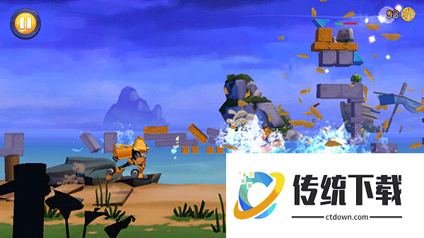 2、攻击炸药箱,不但建筑物会被炸飞,还会波及到旁边的建筑物和捣蛋猪。而且破坏建筑物可以获得更多的金币,可谓一举两得。