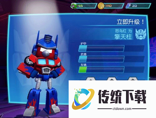 变形金刚的首领,拥有大型卡车的变身形态,是新手登场的必备角色。主要用来过掉第一章的剧情任务,升级后加护甲和武器,所以不需要太多的培养,前期一级就足够了。