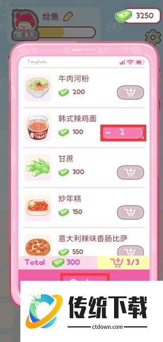 2、在点餐界面选中食物加入购物车,添加完所有物品后点击“Order”;