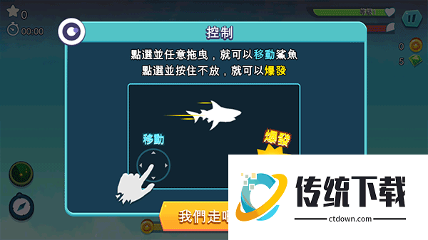 2、我们先熟悉下操作,点击并任意拖拽,就可以移动鲨鱼,点击并按住不放,就可以爆发;