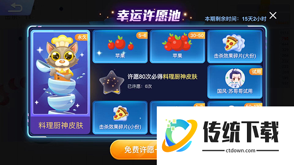 5、幸运许愿池。随意开启一局游戏,死亡之后就可以触发幸运许愿池了,首次许愿是免费的,在许愿池里可以抽取大量的苹果!!