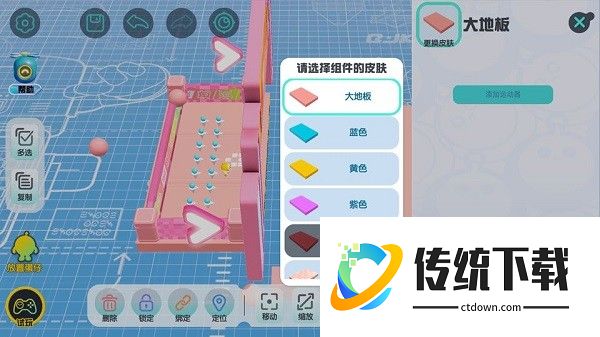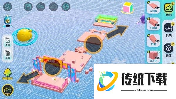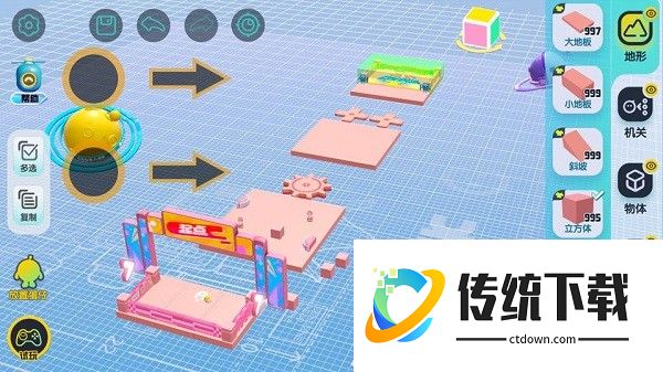 【地形组件】是构成关卡地图的基本组件,通过单指拖拽将地形组件放置在场景中,通过