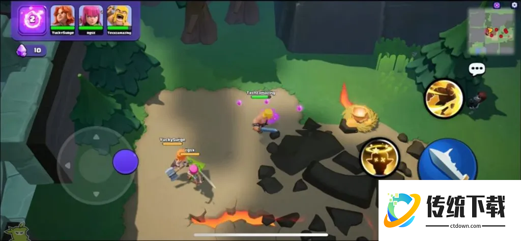 游戏采用玩家熟练的虚拟双摇杆和技能按钮进行操作,可以快速上手游玩