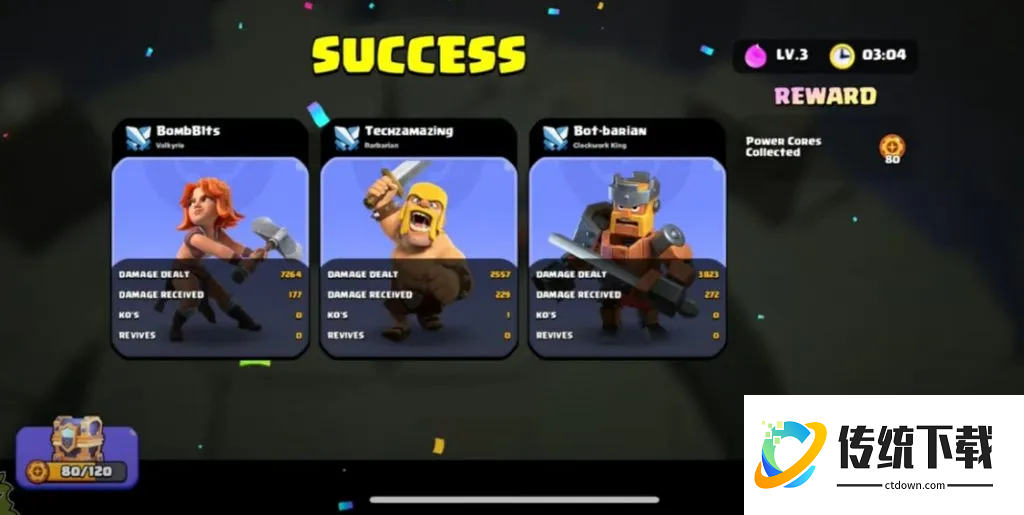 角色养成方面,有健康值和攻击力两个属性,并且有7个技能槽位,玩家可以选择两个技能进入战场。每次通关都可以得到资源和道具奖励,还可以通过闯关表现得到星星,积累一定数量可以开启宝箱,得到角色卡碎片、金币等道具,用来提升角色的阶层,升阶可以提升基础属性、技能伤害,还能够解锁高级技能。