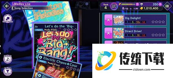 体验高自由度『沉浸式电音节奏』游玩!DJ玩家们可以享受挑战expert等级full combo快感也可以透过auto设定单纯沉浸在电音慢摇节奏中。